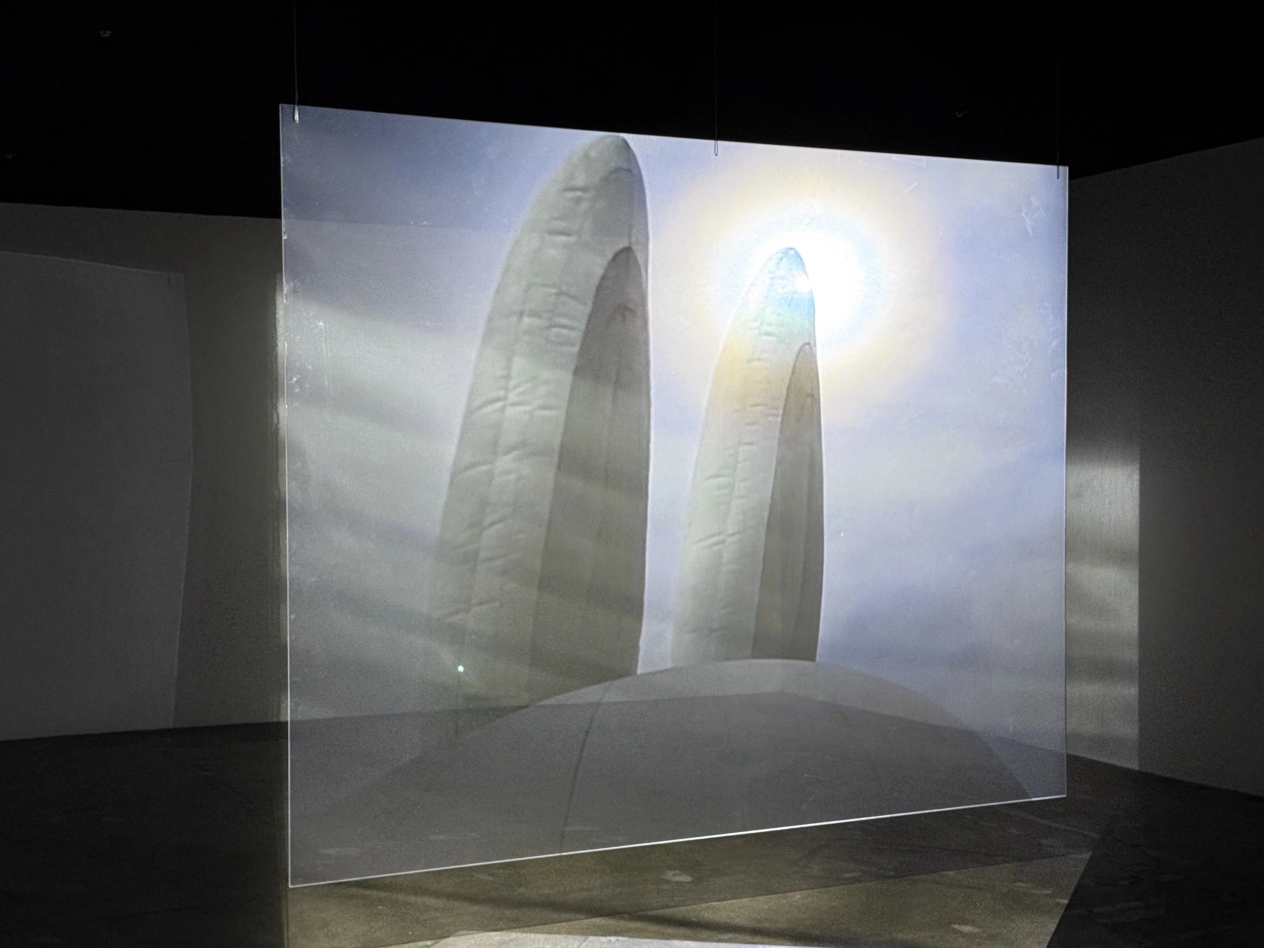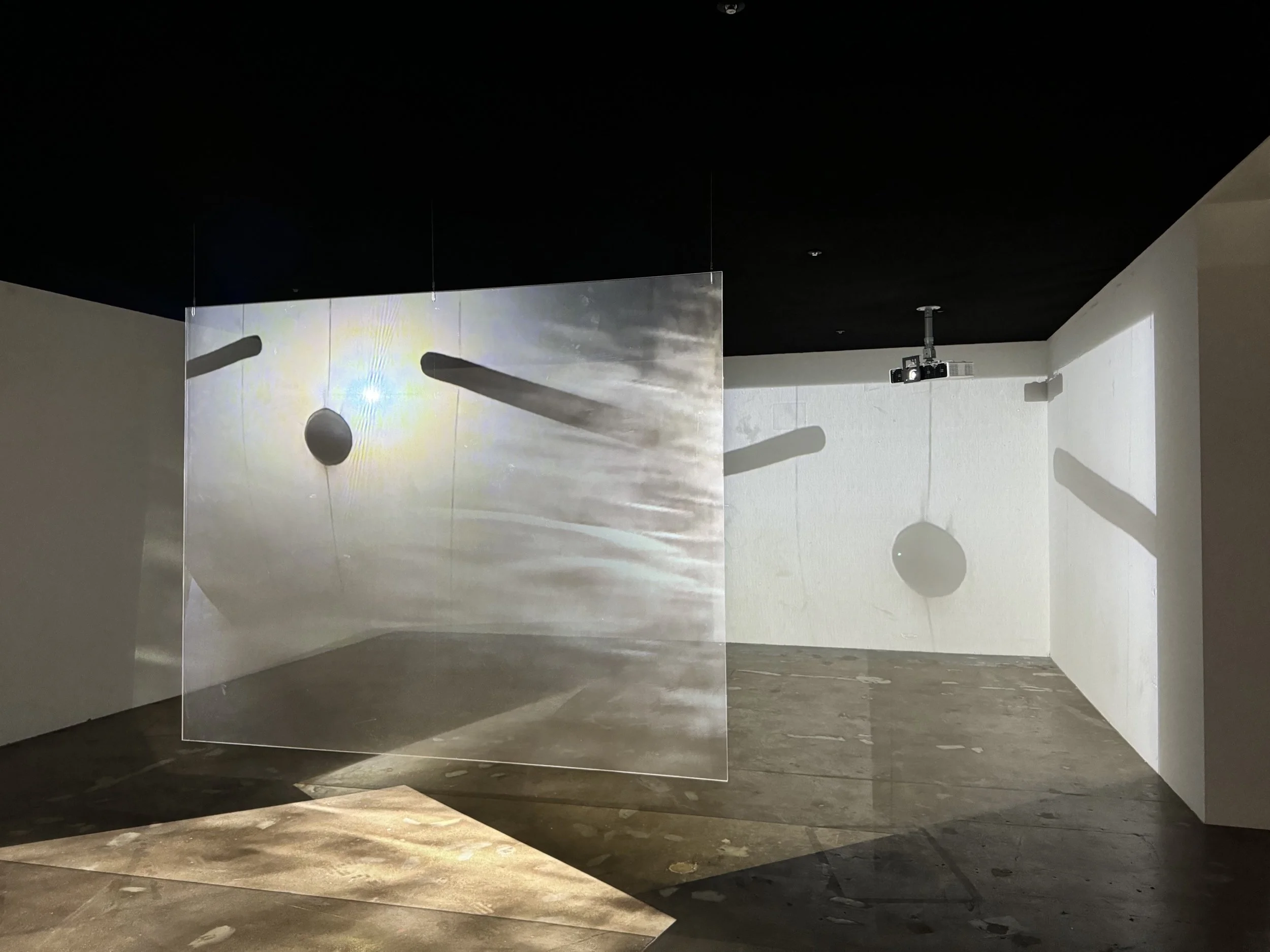 2-channel 16mm film projection, holographic plexiglass, sound, amplifier, latex, mugwort, metal, microphone, red, moon, sun