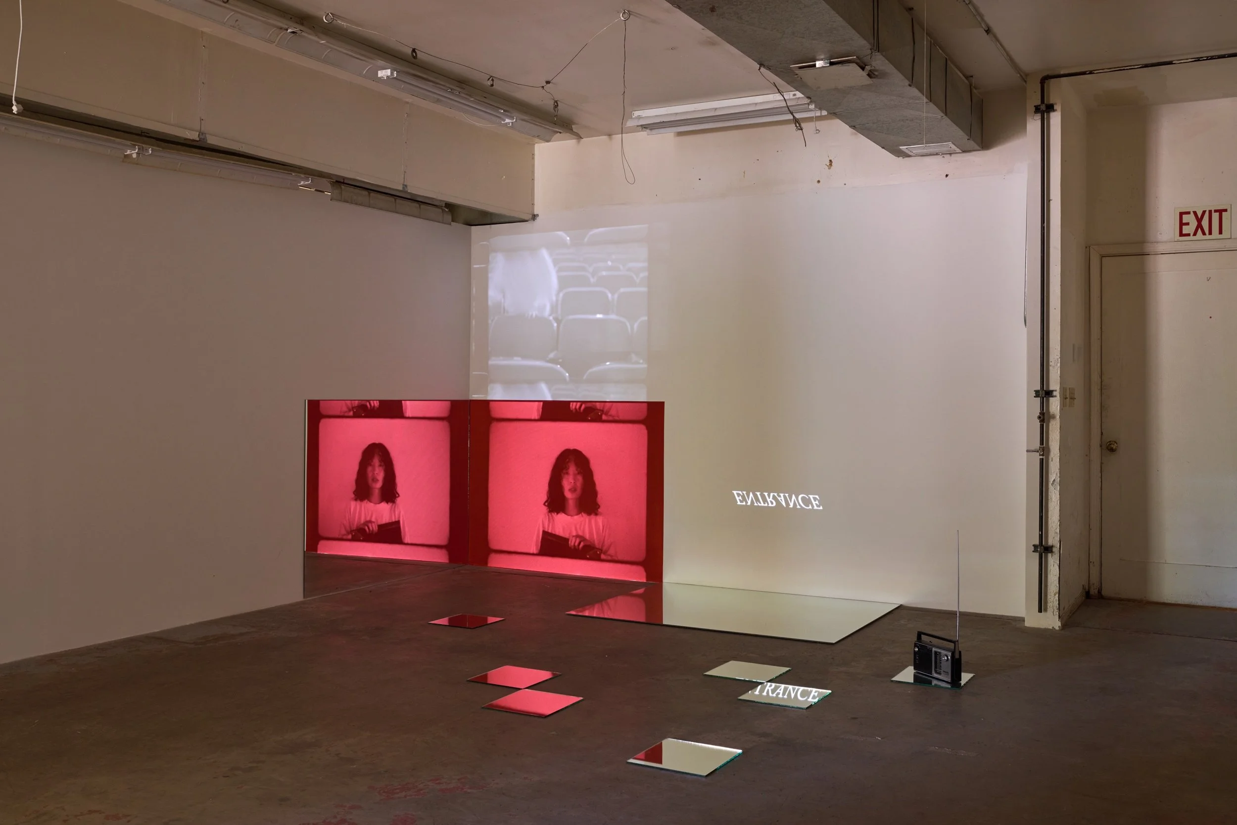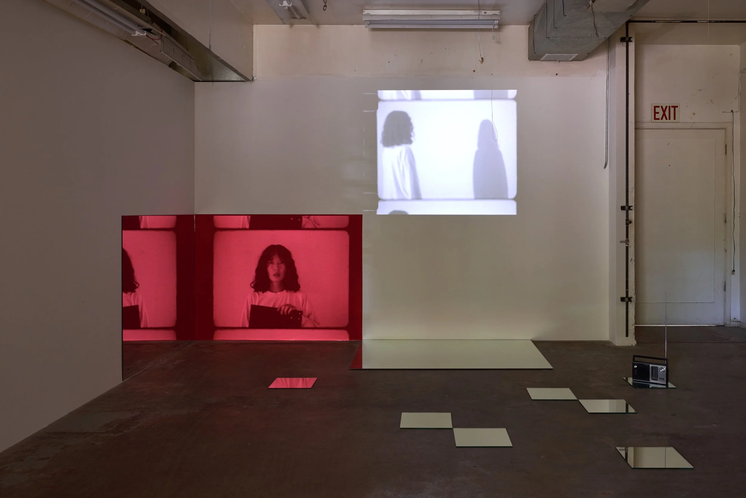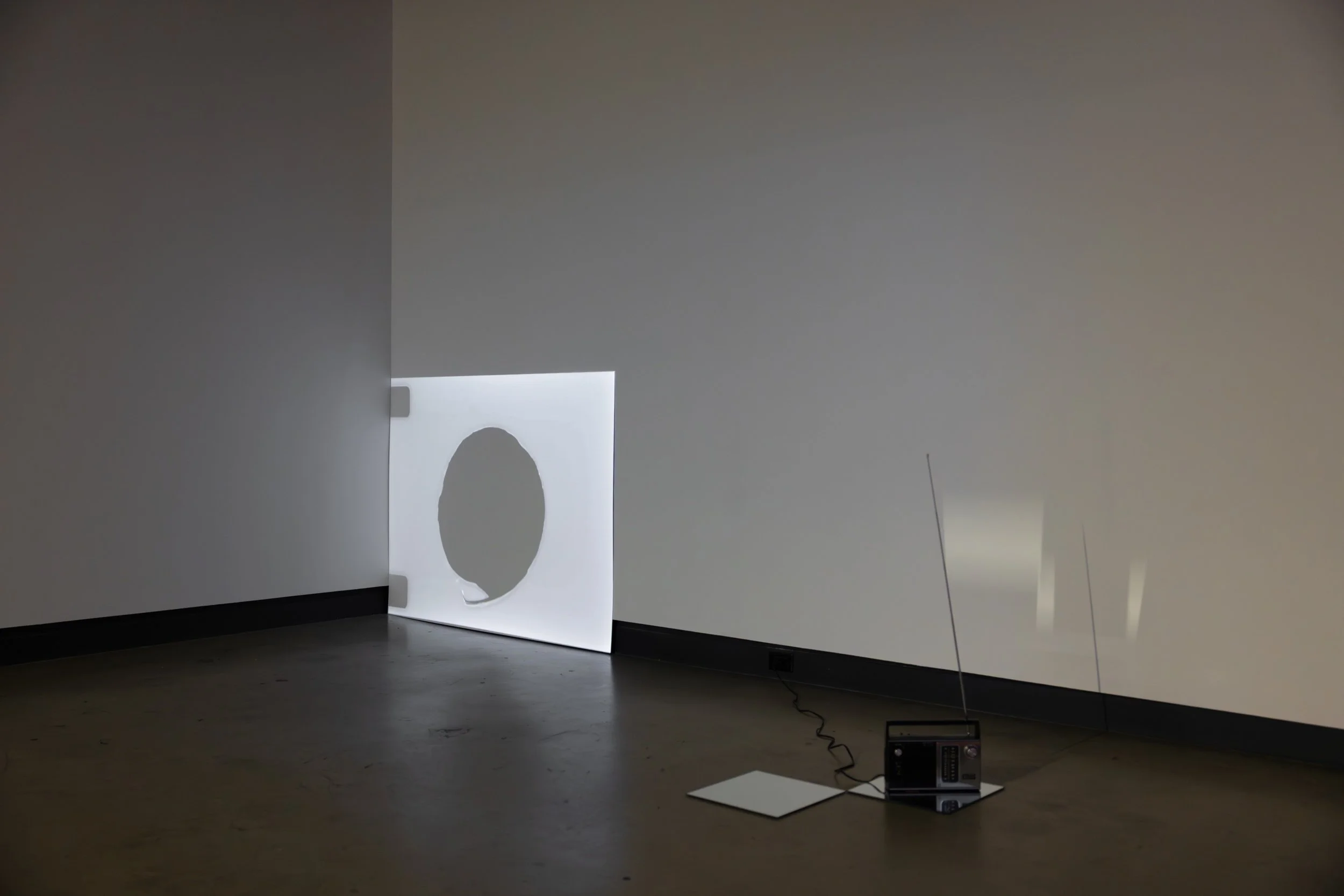 Single-channel 16 mm film transfer to HD video installation with sound, black and white, sound, transmitter, radio, mirrored glass, wood, red paint