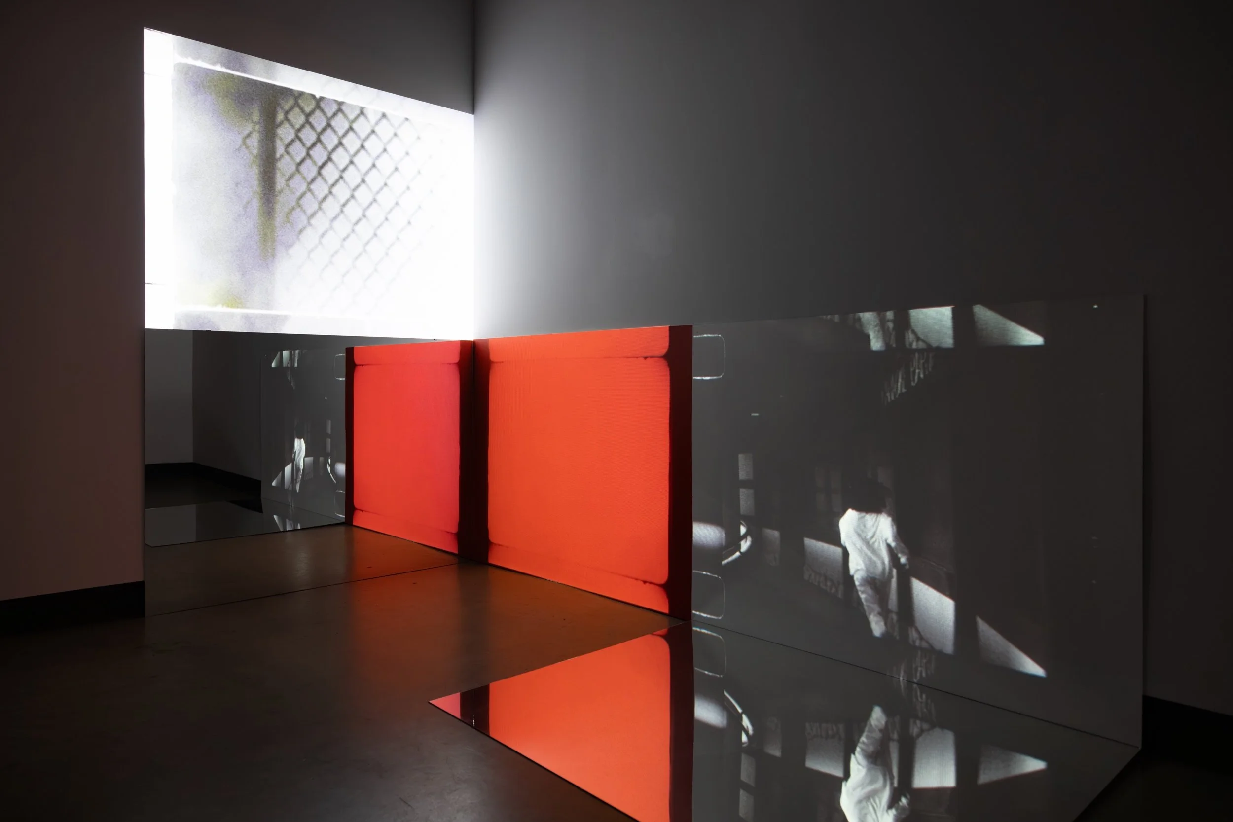Single-channel 16 mm film transfers to HD infrared video installation, black and white and color, sound, mirrored glass, paint